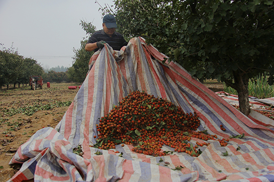 不远处,村民董井双正操作鼓风机清理果堆,伴随着机器的作业声,枯叶与杂物被气流卷起,露出堆成小山的红果。“每亩五千多斤的产量,能有2000多元的收入。”他抹了把额头的汗水笑道,脚下却不停歇地将精选后的果实码放整齐。这些经过初筛的山楂,即将通过村合作社搭建的销售网络,发往山东、东北等地的加工厂。