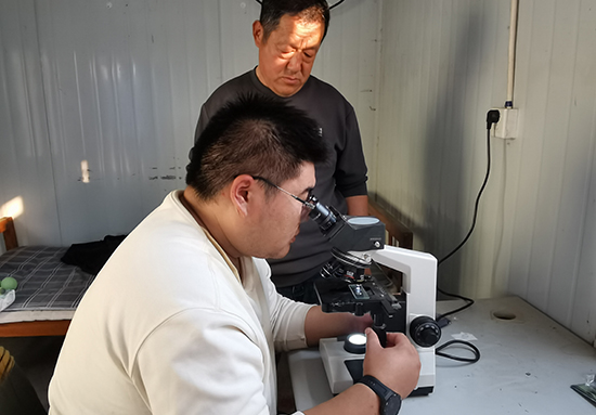 全部鱼苗投放完毕,闫泽基已经累得满头是汗,但仍紧盯水面。为确保万无一失,他随机取样几尾带回实验室,在显微镜下检查鳃丝与内脏。“很干净,鱼鳃无杂质,无寄生虫或病菌迹象,可以放心了。”他合上显微镜,脸上终于露出轻松笑容。