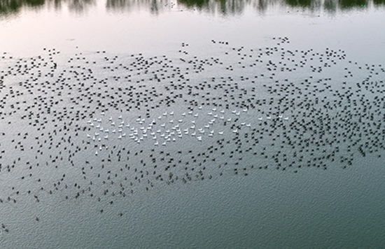 张余广进一步解释,小天鹅通常在10月末陆续抵达衡水湖,偏好在浅水区活动。豆雁则多在10月中下旬大批迁来,常集群栖息于开阔水域与农田周边,二者栖息区域虽有重叠,但大规模同框并不常见。而影像中另一奇观“鸟浪”,则是远处芦苇荡中飞出的千余只花脸鸭,瞬间形成绵延数百米的“鸟浪”,盘旋起落间遮蔽部分天光,与冬日湖光相映成趣。“鸟浪”奇观多在候鸟种群集中起落时出现,此次三种景观叠加,从侧面印证了衡水湖生态环境的持续优化。