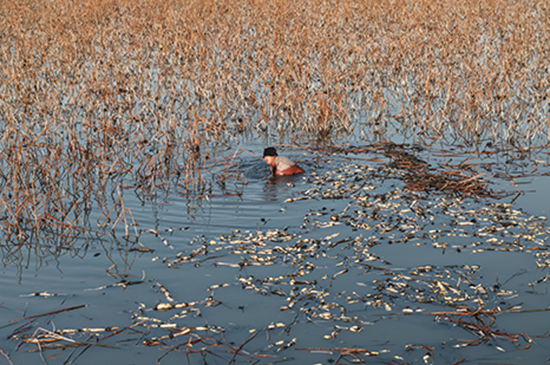 承包人谢晓宝自身也是一名挖藕师傅,他从事挖藕工作已经45年了。“现在虽然有了高压水枪,也戴着防水手套,比过去手挖脚踩时省力些、安全些,但长时间的浸泡和弯腰,身体还是吃不消。”谢晓宝一边分拣莲藕一边说。摘下手套,他的手指因经常被冷水浸泡有许多开裂,指尖与掌心处可以看到长年劳作积累的老茧。“天气逐渐变冷了,橡胶防水衣里面还要穿上棉衣,在水里行动更不方便了。”谢晓宝补充道。