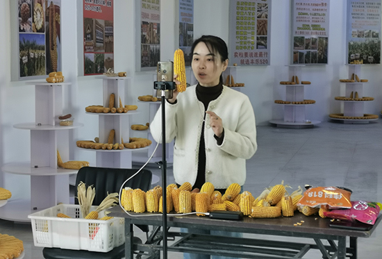 在故城农商通电子商务有限公司直播间,主播红姐正举着一根金灿灿的玉米,对着镜头热情推介:“家人们看,这就是‘伟科818’成熟后的样子!穗匀、粒深、颜色亮,抗倒伏、产量稳,亩产900公斤以上!”她轻轻掰开紧密排列的籽粒,“现在下单的种子,种出来的玉米,就长这样!”桌上还摆着不同品种的果穗作对比。郭爱民拿着一穗玉米笑着说:“乡亲们认准这个穗形才敢买种子。我们现场展示,就是让大家买得明白、种得踏实。”