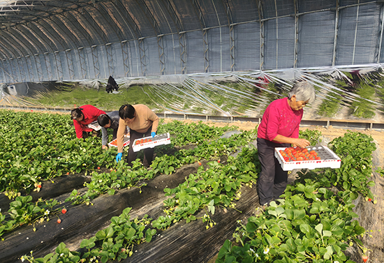 此时,工人们早已穿梭在田垄间忙碌,采摘、称重、分拣、装盒,动作娴熟利落。杨宅城村的张会芳弓着身子,小心翼翼捏住草莓果蒂轻轻一拧,一颗完好的草莓便落入果箱。“从育苗开始,我们就守在大棚里,疏花、疏果,看着草莓从青果长成红果,心里高兴得很!” 张会芳笑着说。“以前冬天闲在家没收入,如今在园区打工,日子过得充实又有奔头。”阳光透过棚膜洒下斑驳光影,与工人们忙碌的身影交织,尽显劳作与丰收的和谐之美。