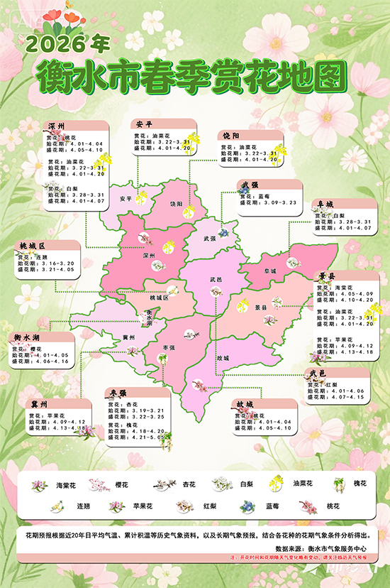 春风送暖,万物复苏。近日,为了满足公众踏青赏花的期待,衡水市气象局在往年基础上,结合更精细化的气象数据,正式发布《2026年衡水市春季赏花地图》,邀您共赴一场繁花之约。