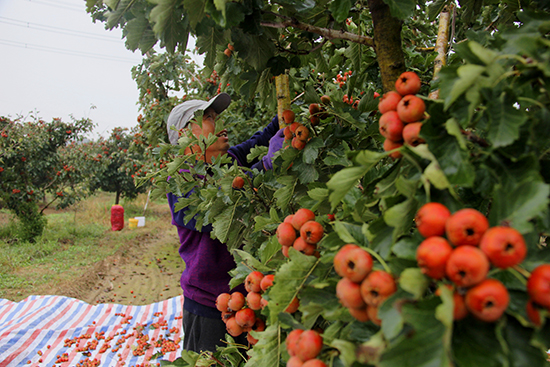 不远处,村民董井双正操作鼓风机清理果堆,伴随着机器的作业声,枯叶与杂物被气流卷起,露出堆成小山的红果。“每亩五千多斤的产量,能有2000多元的收入。”他抹了把额头的汗水笑道,脚下却不停歇地将精选后的果实码放整齐。这些经过初筛的山楂,即将通过村合作社搭建的销售网络,发往山东、东北等地的加工厂。