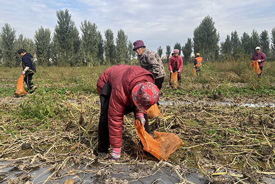 这片南瓜地,是从村民手中流转而来。农户不仅能拿到稳定的土地流转收益,还能通过务工、分红实现多重增收。57岁的王军亭正麻利地把个头均匀、表皮光滑的南瓜装进编织袋,笑着说:“现在来种植基地干活,既能挣钱又能照顾家里,比出去打工踏实多了。”