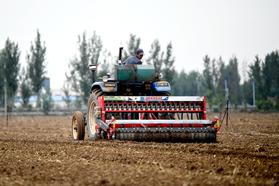 在阜城县崔家庙镇后砖门村种粮大户李洪亮家1060亩麦田里,秋播作业更具“科技含量”。大型撒肥机、旋耕机、播种机在田间有序穿梭,伴随着机械轰鸣声,从精准撒肥到深度旋地,再到精量播种,一套标准化的冬小麦秋播流程高效运转。“从2016年开始承包土地种植大田作物,这些年通过不断摸索,我总结出三大‘高产经验’:利用凹盘撒播肥料,确保肥料均匀覆盖;把播种机从16行改成19行,想高产就得保证亩穗数;再就是提前做好病虫害防治。”李洪亮望着刚刚播完的麦田,脸上满是期待,“现在种麦子都是科学方法,县农技站的技术员经常来指导,从施肥配比到播种时机都讲得明明白白,我对来年有个好收成很有信心!”