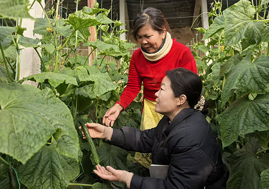 1月19日,武邑县气象局气象服务人员走进审坡镇黑林村黄瓜种植大棚,实地查看棚内温度、作物长势,并就近期大幅降温天气向农户提供应对指导。